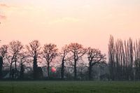 Rode zon komt op achter de kale bomen tegen een roze lucht bij landgoed Oud Amelisweerd in Bunnik.