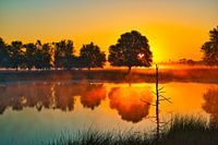 Boven het water hangt nog een beetje mist waardoor de zonnestralen zonneharpen worden en de reflectie een beetje wazig wordt.