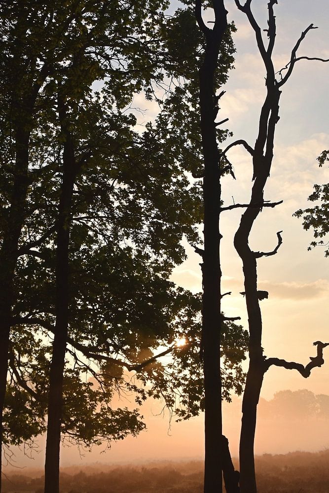 Het mooiste uit deze foto voor mij is de zon die net achter de wolken doorkomt, en de mist die je nog ziet hangen net boven de heide, helemaal in dezelfde kleur als die zon.