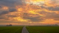 Een zonsopkomst met grondmist in de zomer omgeving Groetpolder in de gemeente Hollands Kroon. Met zicht op de provincie weg provinciale weg N242 en Windpark Oudelandertocht.