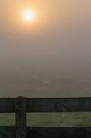 Zon komt op boven polder bij Zoetermeer. Mist en dauwdruppels in een spinnenweb.