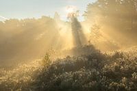 de zon komt op boven de heide en veroorzaakt zonnestralen door de mist
