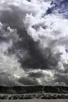 dreigende bewolking boven het duingebied tussen muy en slufter op texel. lage duinen met daarvoor beginnende duinvorming. en stukje blauwe lucht.