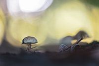 close up van een klein wit zwammetje op de donkere bosgrond, met een lichte geel groene bokeh achtergrond