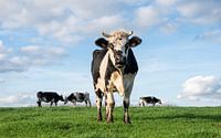 zwart bonte koe met hoorns in groen Belgisch weiland kijkt met vreemde blik in de camera onder blauwe hemel en witte wolken met drie koeien op de achtergrond