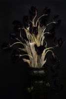 mysterieus beeld van stilleven van gedroogde zwarte tulpen op een zwarte ondergrond.