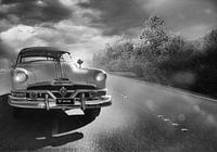 Zwart/wit foto met landschap, waarin een oldtimer staat. De gerestaureerde Pontiac Chieftain uit 1952 heeft een nummerbord met : I love my car.