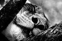 leeuw in Lake Manyara Tanzania in zwart-wit fotografie. De leeuw slaapt in een boom.