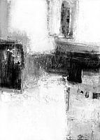 Deze afbeelding is een abstract zwart-wit schilderij met krachtige penseelstreken. De compositie wordt gedomineerd door contrastrijke gebieden van zwart en wit, waardoor een dynamisch spel van licht en schaduw ontstaat. De ruwe, gelaagde verflaag geeft het werk een rauwe, expressieve kwaliteit die emoties van intensiteit en diepte oproept. De geometrische vormen en organische texturen vloeien in elkaar over, waardoor het een opvallend modern kunstwerk is dat op meerdere manieren kan worden geïnterpreteerd. Het schilderij heeft een sterke visuele impact en doet denken aan abstract expressionisme en hedendaags minimalisme.