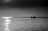 Een motorboot steekt af tegen de lichtere achtergrond, de zwarte romp steekt af tegen de bleke zwarte en grijze tinten van het oceaanoppervlak. Terwijl het aan de rechterkant van het frame van ons wegvaart, creëert het kielzog een subtiel spoor achter het schip dat een gevoel van beweging en energie overbrengt.