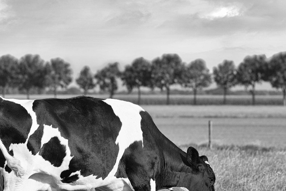 Grazende Holstein-Friese zwart-witte koe in een weiland met dramatische wolken, Nederland