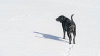 Een foto van een zwarte Labrador op witte sneeuw