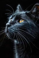 Een zwarte kat op een zwart doek lijkt als een silhouet te zweven in de duisternis. Haar glanzende vacht vangt nauwelijks licht op, waardoor haar contouren slechts vaag te onderscheiden zijn. Haar ogen, als fonkelende edelstenen, zijn de enige bron van contrast op het donkere canvas. De kat straalt een aura van mysterie en elegantie uit, als een schimmige verschijning uit het rijk van de nacht.