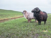 een zwart en een wit schaap turen naar de overkant van de sloot, want daar ligt een sappig groene dijk om te begrazen