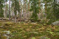Karakteristiek boslandschap in de provincie Småland in Zweden. voornamelijk een rotsbodem en rotsen met als vegetatie naaldhout en bessen struiken en varens.