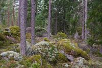 Karakteristiek boslandschap in de provincie Småland in Zweden. voornamelijk een rotsbodem en rotsen met als vegetatie naaldhout en bessen struiken en varens.