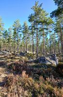 zweeds landschap met blauwe lucht en dennenbomen en rotsblokken typerend voor smalland en droge vegetatie wat in de zomer weer fris en groen zal zijn met bessen het is een glooiend geheel het is in Smalland lingon bessen. heuvel rug